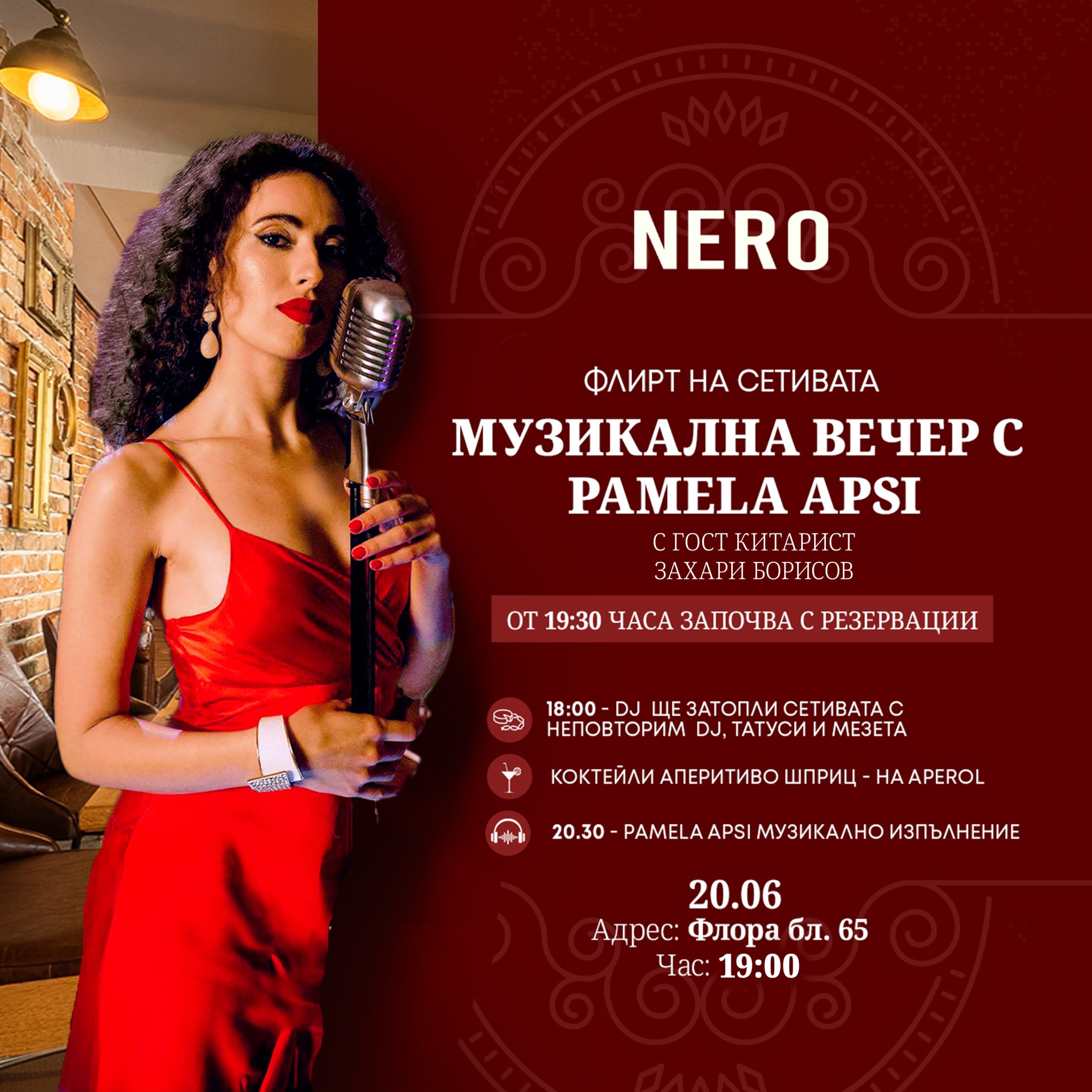 Готови ли сте за една провокативна, щура и изключително цветна музикална вечер? С невероятния си талант и красив глас PAMELA APSI неусетно ще ни пренесе под жаркото слънце на Рио. Гост китарист ще бъде Захари Борисов. Ще танцуваме, водени от горещите ритми, а защо не и да попеем заедно? Стартираме в 18:00 ч. с Аперетиво бар, коктейли, тапас и музика от DJ, а по-късно всички заедно ще се насладим на шоуто на PAMELA APSI